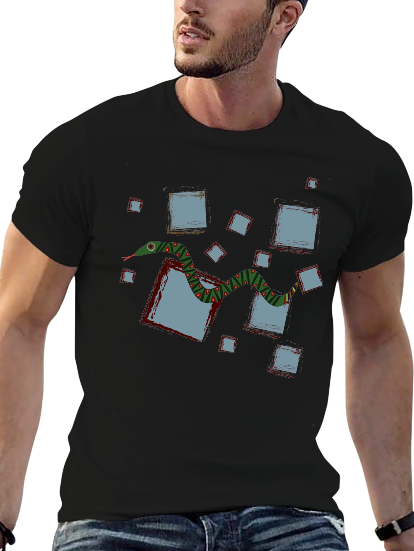 Show off your unique style with this eye-catching black t-shirt. Featuring an abstract design with a stylized green snake winding through a series of blue squares, this shirt is sure to turn heads. The snake design includes a red tongue and yellow accents. The playful geometric pattern and bold colors give this shirt a modern, artistic vibe. Made from comfortable materials, it's perfect for casual wear, expressing your personality, and making a statement. Pair it with jeans, shorts, or your favorite streetwear for a cool, confident look. Add this distinctive piece to your wardrobe today!