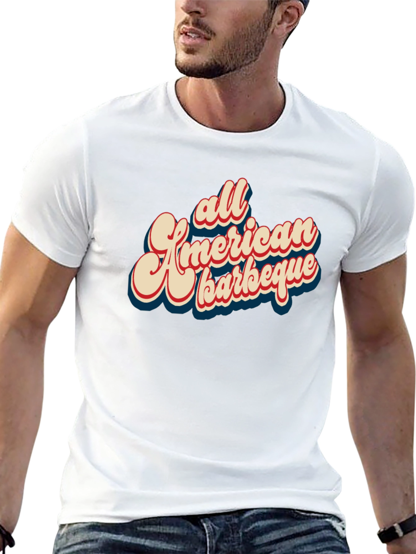 Show your love for BBQ with this classic-fit t-shirt. Made from a soft, comfortable fabric, this short-sleeve tee features a bold, retro-inspired graphic that reads "All American Barbeque." The vintage design is eye-catching and sure to be a conversation starter at your next cookout, summer gathering, or casual event. Pair it with jeans or shorts for a relaxed and stylish look. This unique shirt is perfect for barbeque lovers and anyone who enjoys classic American style. It would make a great gift for the pitmaster in your life.