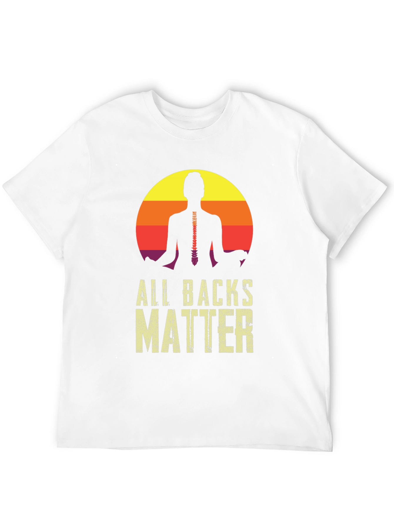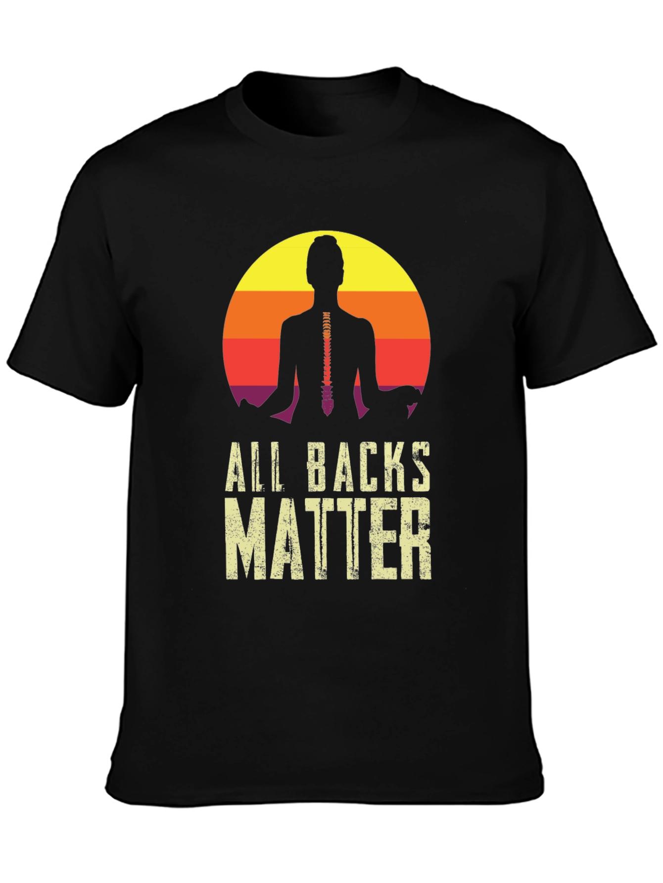 This stylish black t-shirt features a unique design perfect for yoga enthusiasts and advocates for back health. The graphic showcases a silhouetted figure in a meditative pose against a vibrant sunset backdrop, with a visible spine detail. Below, the text "ALL BACKS MATTER" is printed in a bold, distressed font, creating a visually appealing statement piece. Made from a soft, comfortable fabric, this tee is ideal for casual wear, yoga classes, or as a conversation starter about spinal health and wellness. Show your support and look great doing it!