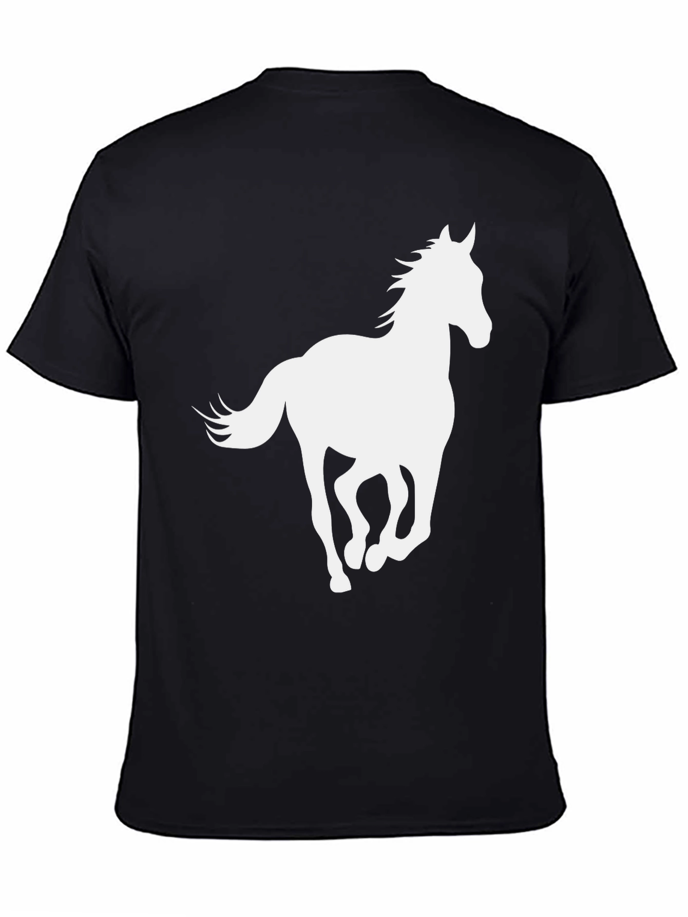 This stylish black t-shirt features a bold white graphic of a running horse, creating a striking contrast. The classic fit makes it a comfortable and versatile addition to any wardrobe. Made from what appears to be a soft, breathable fabric, this tee is perfect for casual everyday wear. Show off your love for horses or add a touch of unique style to your look. Ideal for weekend outings, casual gatherings, or simply lounging at home. This shirt is sure to turn heads and spark conversation. A great gift for animal lovers and fashion-forward individuals alike.