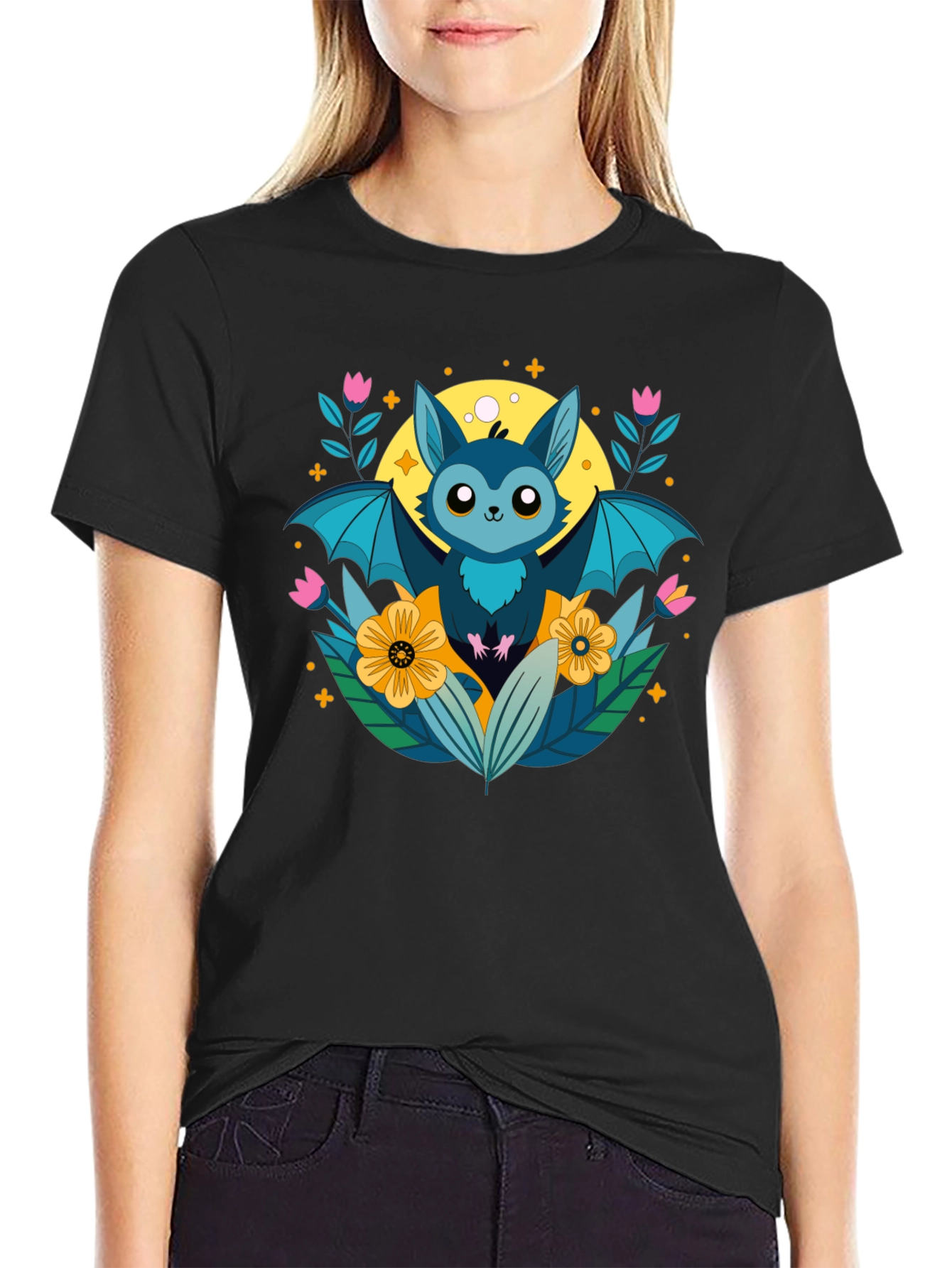 Show off your love for nature with this adorable bat graphic t-shirt! Featuring a cute cartoon bat surrounded by colorful flowers and foliage, this black tee is perfect for casual wear. The vibrant design pops against the dark fabric, making it a fun and eye-catching addition to your wardrobe. Comfortable and stylish, this t-shirt is ideal for everyday wear, nature walks, or simply expressing your unique personality. Made with a soft, breathable fabric for all-day comfort.