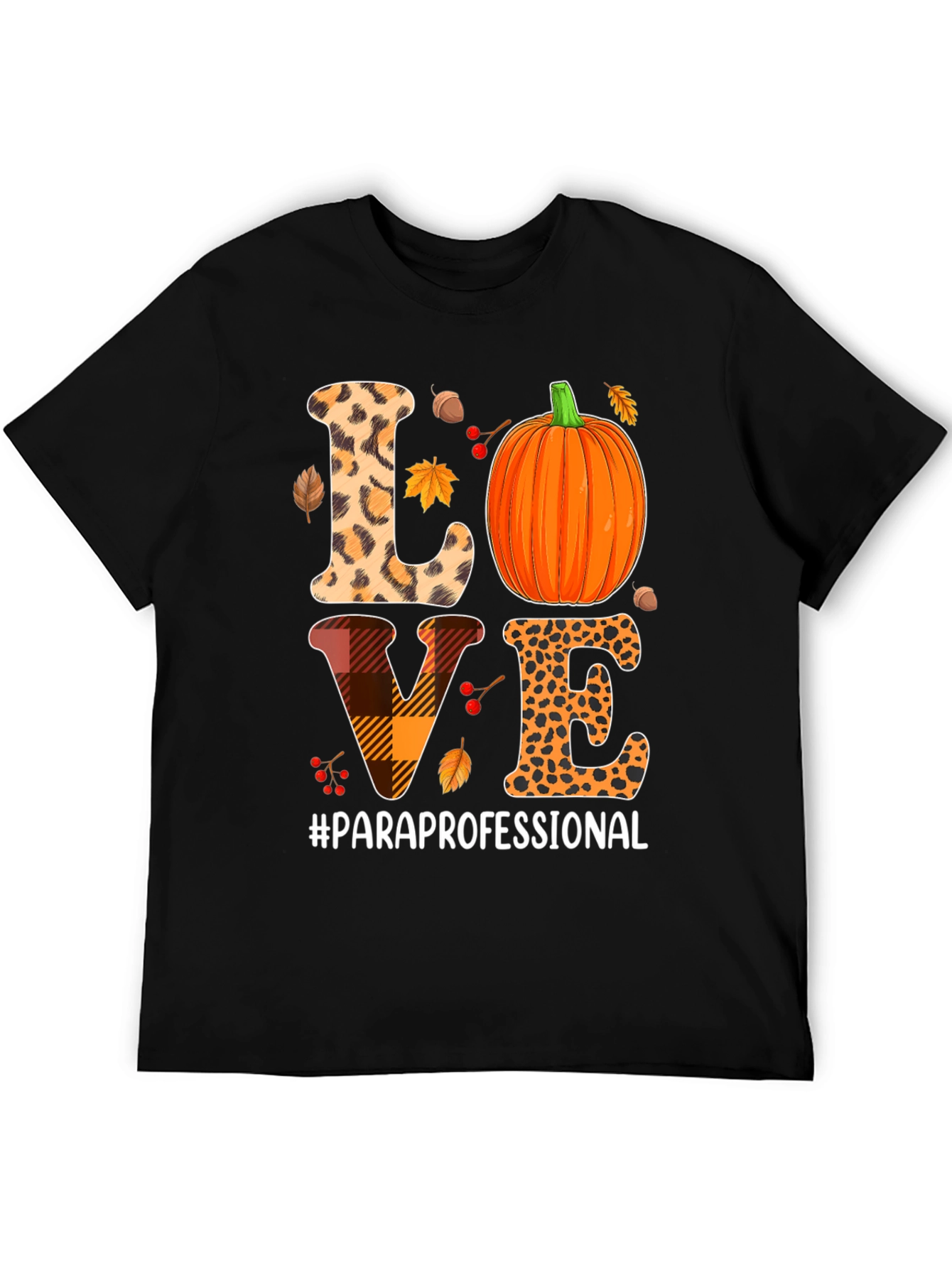 Show your love for fall and your paraprofessional role with this stylish t-shirt. This black tee features the word "LOVE" crafted from unique autumn-themed patterns. The "L" boasts a leopard print, while the "O" is replaced by a bright orange pumpkin. A plaid pattern fills the "V," and the "E" is also in leopard print. The hashtag "#PARAPROFESSIONAL" is prominently displayed, celebrating your profession. Perfect for casual wear during the fall season, school events, or as a thoughtful gift for your favorite paraprofessional.