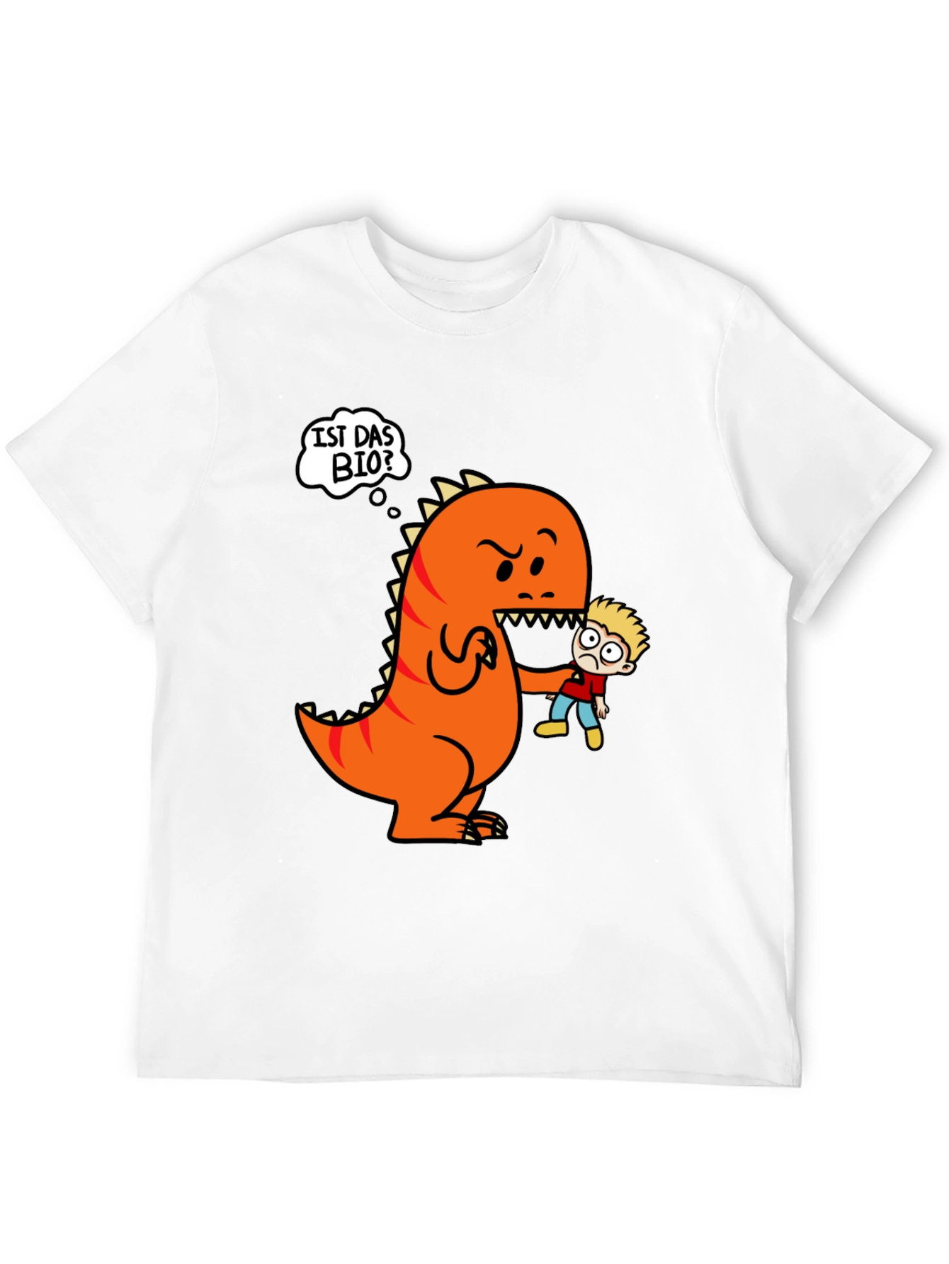 This black t-shirt features a humorous cartoon design of an orange dinosaur holding a small person, with a thought bubble saying 'Ist Das Bio?'. The design is eye-catching and printed on what appears to be a soft, comfortable cotton fabric. This short-sleeve crew neck is perfect for casual wear, adding a touch of fun to any outfit. Ideal for those with a quirky sense of humor, this shirt is sure to spark conversations. Wear it to parties, casual outings, or just lounging around, and let the humorous design speak for itself. A fun and unique addition to any wardrobe!