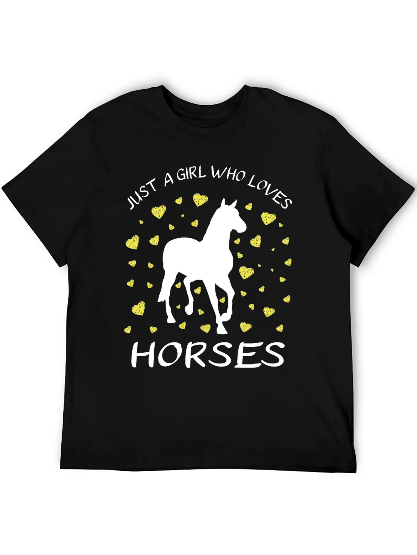 Show your love for horses with this stylish black t-shirt. The shirt features a graphic design of a white horse surrounded by yellow hearts. Above the horse, the phrase "JUST A GIRL WHO LOVES" is printed, while the word "HORSES" completes the design below. Made from a comfortable, breathable fabric, this t-shirt is perfect for casual wear, horse riding events, or simply expressing your passion for horses. The classic fit makes it a great gift for horse lovers of all ages. Stand out from the crowd with this unique and charming t-shirt. It's more than just a shirt; it's a statement!