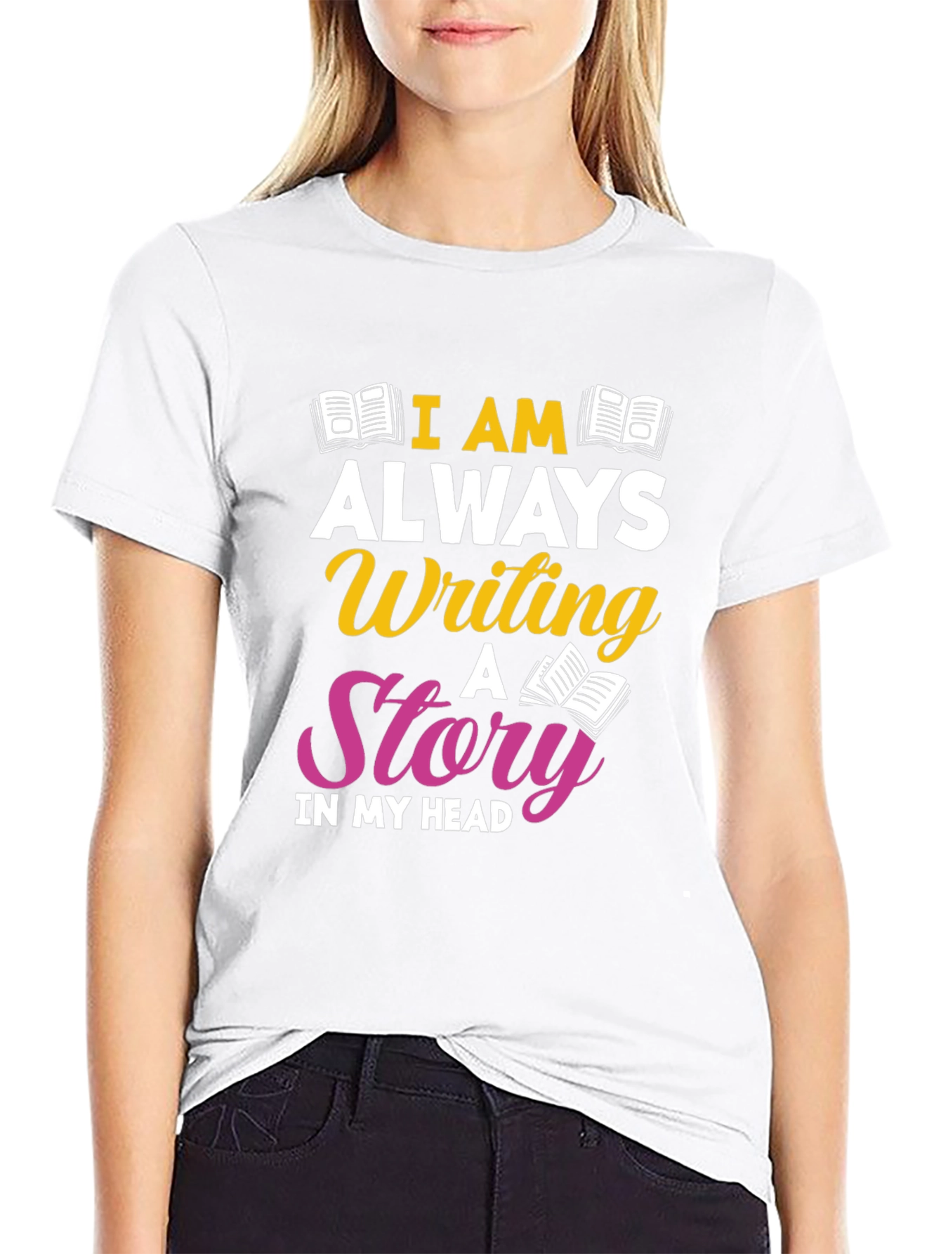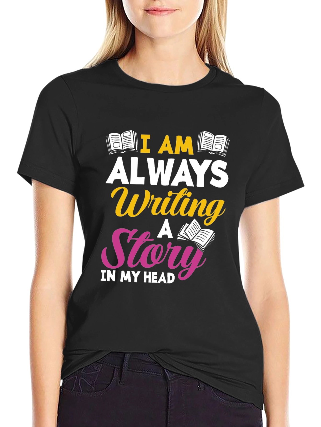 Express your love for storytelling with this unique graphic tee! Featuring the phrase "I am ALWAYS Writing a Story IN MY HEAD" in a mix of vibrant yellow, white and pink fonts, this shirt is perfect for writers, avid readers, or anyone who loves to get lost in a good book. The playful design incorporates book illustrations, adding a whimsical touch. Made from comfortable fabric, this tee is ideal for everyday wear, casual outings, or cozy reading sessions. A perfect gift for the bookworm in your life!