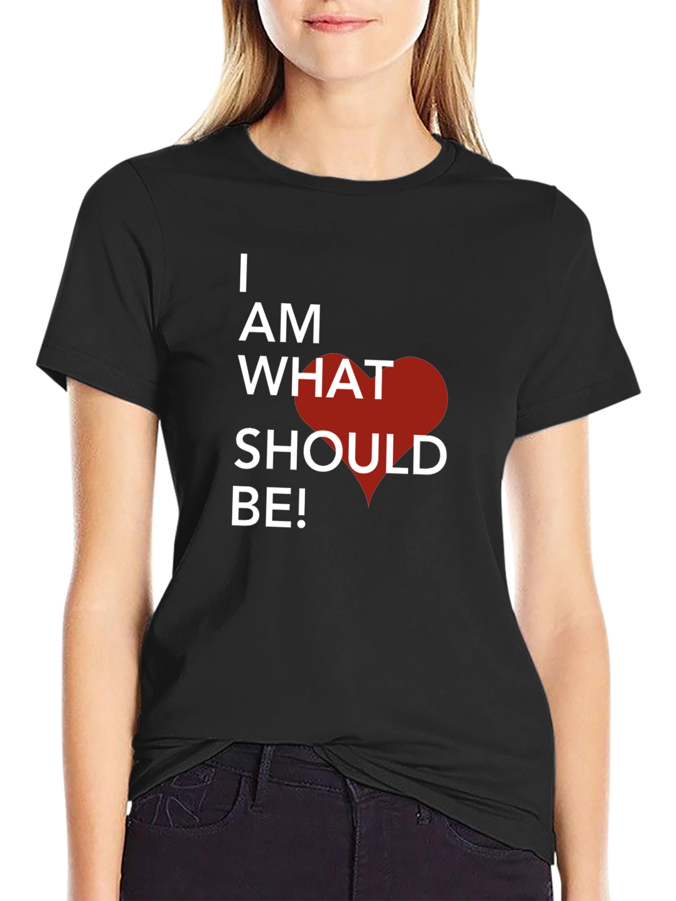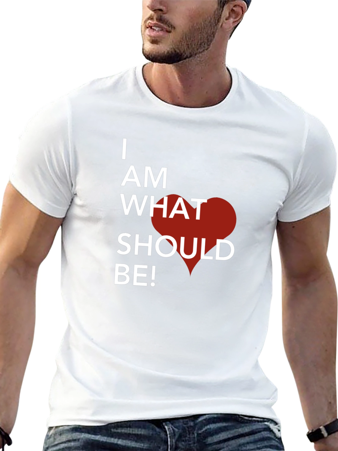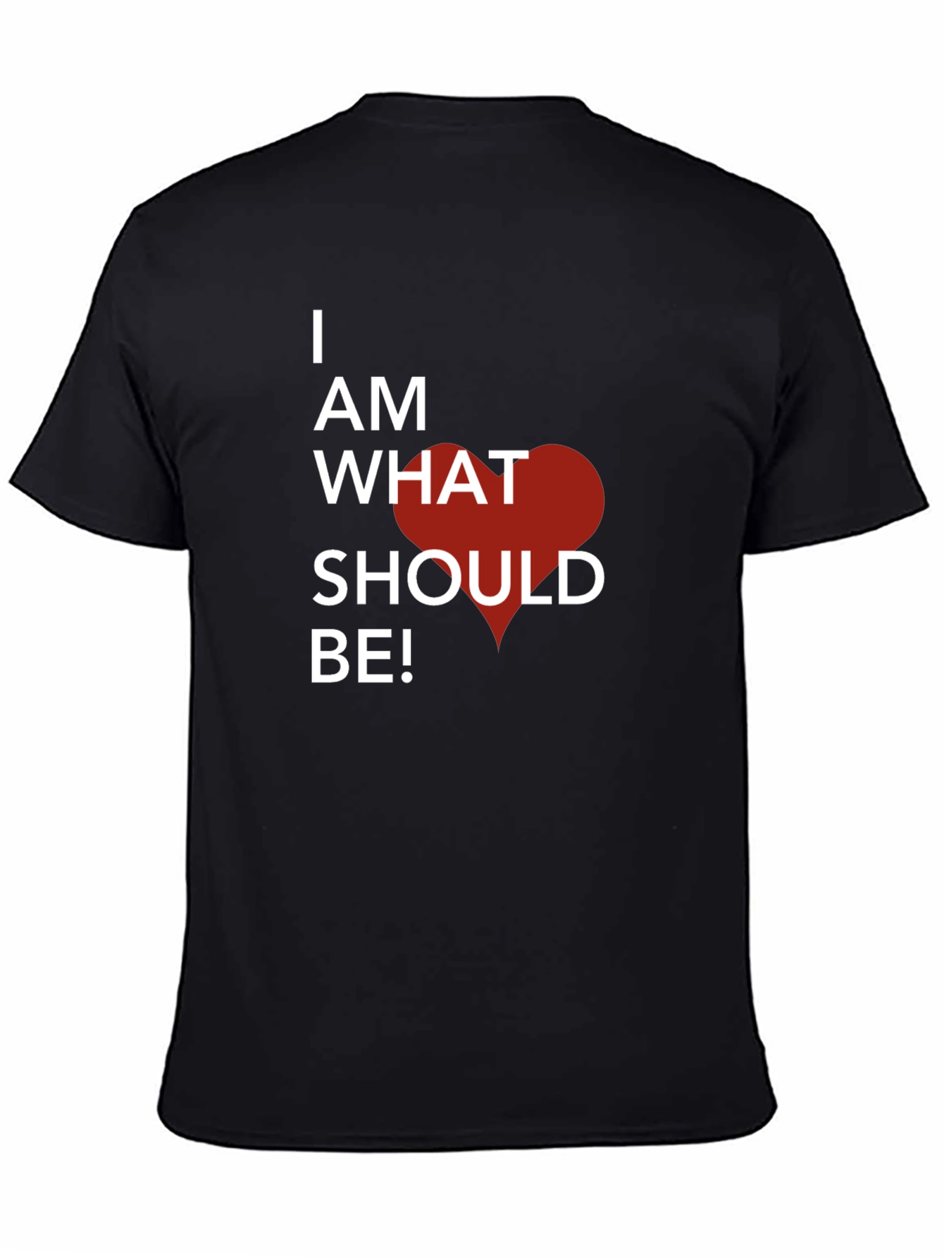Express yourself with this unique graphic t-shirt! This black tee features the empowering message 'I AM WHAT SHOULD BE!' in bold white text, complemented by a striking red heart design. Made from a comfortable and breathable fabric, this shirt is perfect for everyday wear. Show off your individuality and make a statement wherever you go. Ideal for casual outings, social gatherings, or as a thoughtful gift for someone special. This t-shirt combines style and substance, letting you wear your heart on your sleeve (literally!). Grab yours today and embrace your true self!