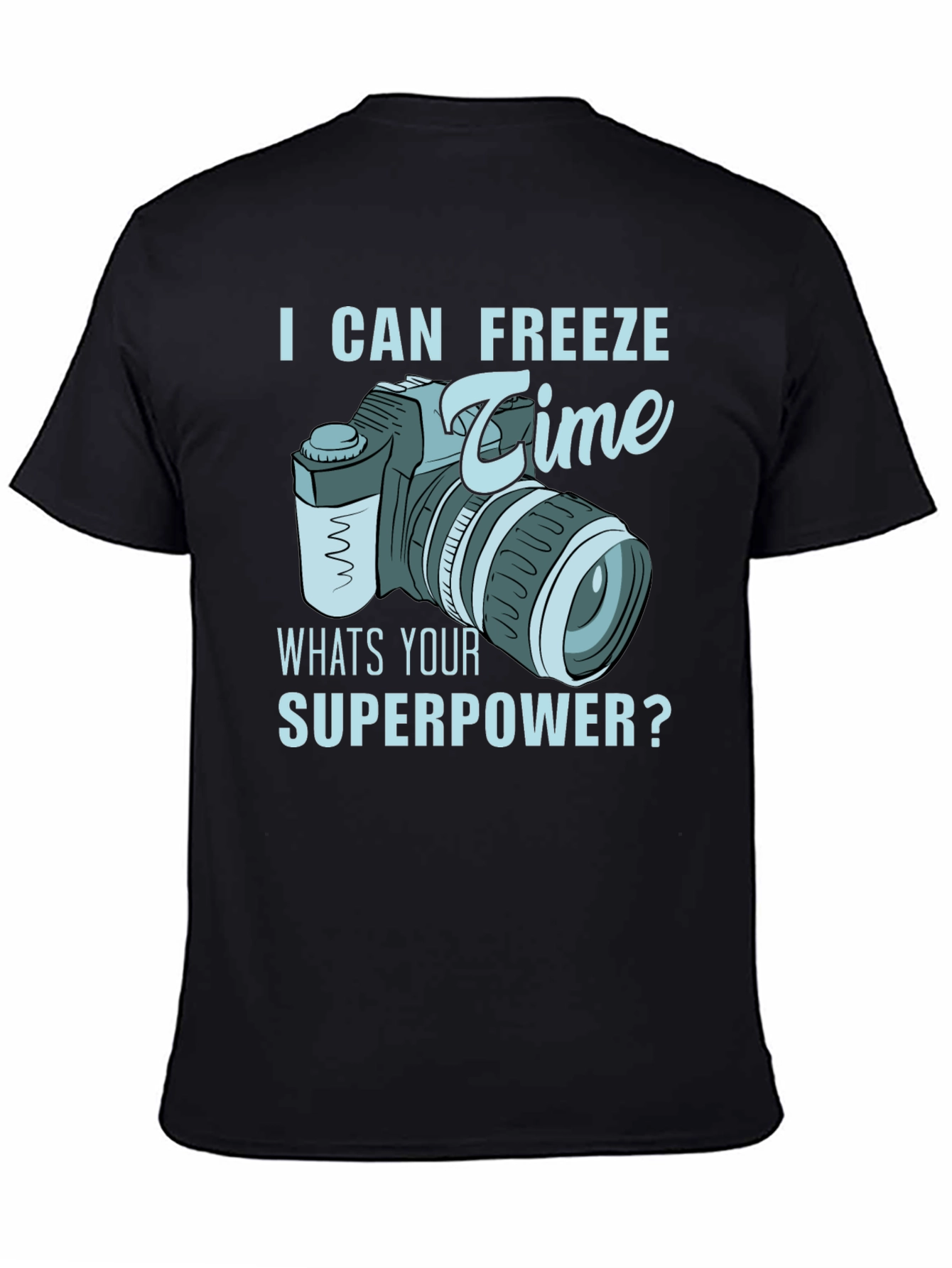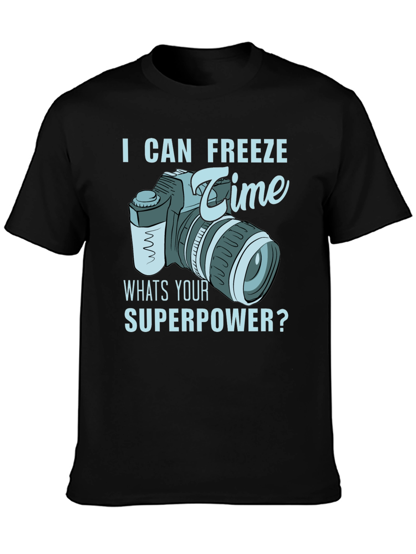 Capture memories in style with this fun and stylish black t-shirt. Featuring a striking graphic of a camera with the phrase "I Can Freeze Time, What's Your Superpower?", this tee is perfect for photographers and anyone who loves capturing moments. The cool blue-toned design pops against the black background, making it a standout piece. Made from comfortable, breathable fabric, it's ideal for everyday wear or photography outings. Show off your passion for photography with this unique and conversation-starting t-shirt.