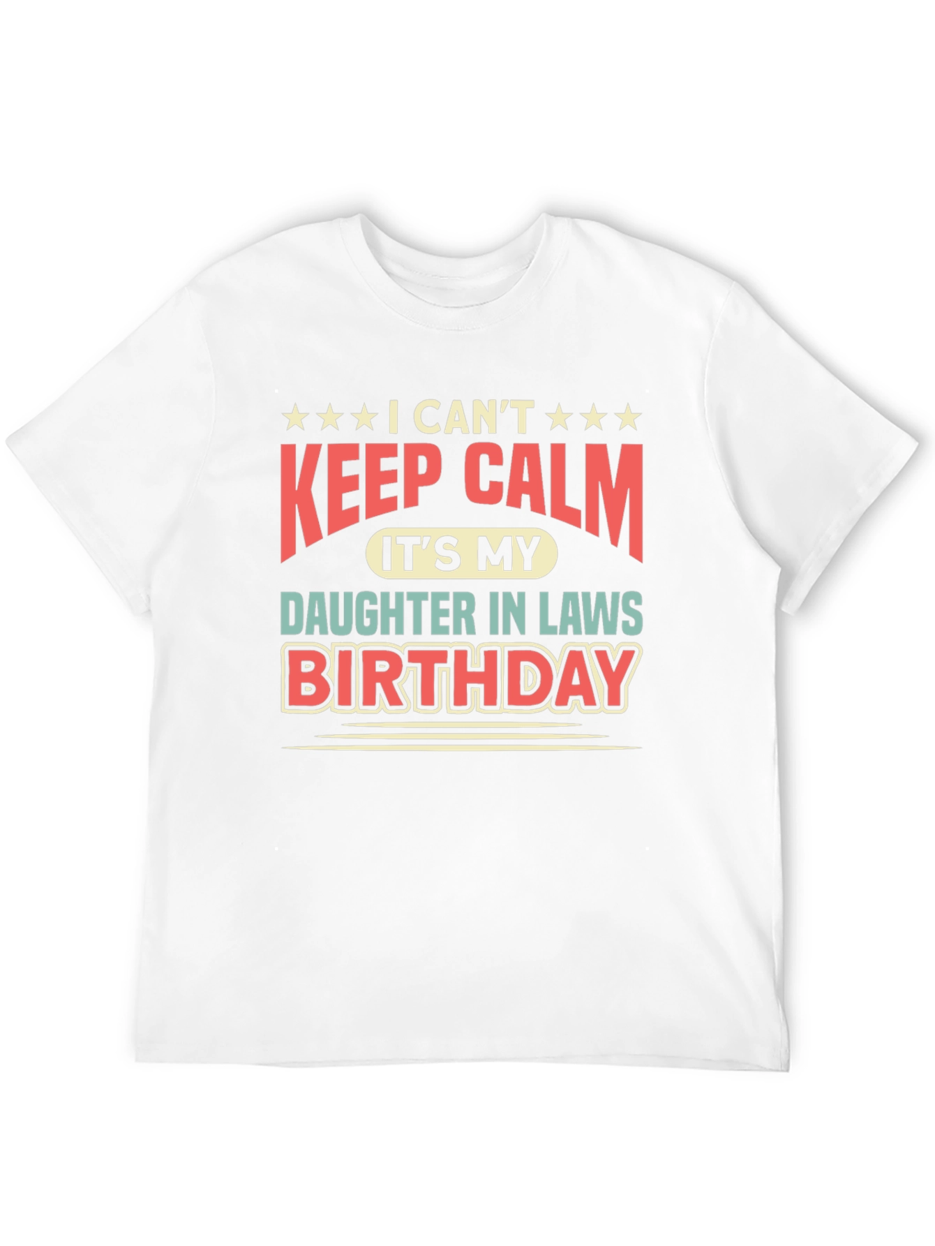 Celebrate your daughter-in-law's special day with this fun and eye-catching black t-shirt! The design features the phrase "I Can't Keep Calm It's My Daughter In Law's Birthday" in a bold, retro-inspired font with decorative stars. The red and teal color scheme makes it pop, ensuring you stand out at the birthday celebration. Made from a comfortable-looking fabric, this tee is perfect for casual wear and lets everyone know how much you care. Get yours now and be ready to party!