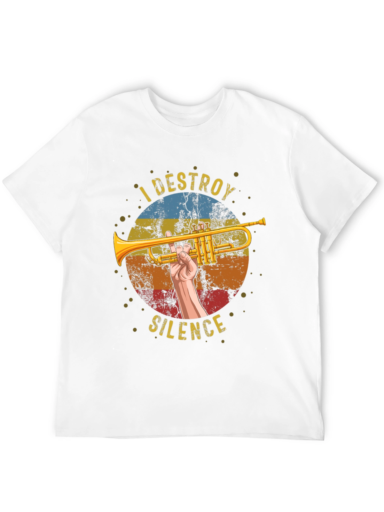 Rock this cool black graphic tee featuring a vibrant trumpet design! The graphic shows a hand holding a gold trumpet against a retro sunset backdrop, with the witty phrase 'I DESTROY SILENCE'. Made from comfortable, breathable fabric, this t-shirt is perfect for musicians, music lovers, or anyone with a playful sense of humor. It's a great conversation starter and a stylish way to express your passion for music. Ideal for casual wear, concerts, or band practice. Add some musical flair to your wardrobe today!