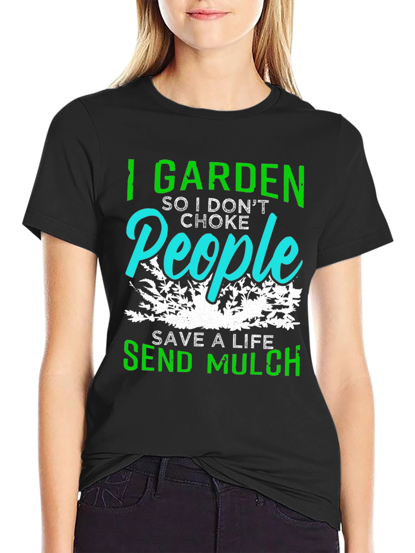 This eye-catching black t-shirt features a humorous gardening-themed design. The shirt prominently displays the phrase "I GARDEN SO I DON'T CHOKE People" in vibrant green and turquoise lettering, with a graphic of plants. Below, it reads "SAVE A LIFE SEND MULCH" also in green. This witty shirt is perfect for gardeners with a sense of humor. Made from comfortable material, it's ideal for casual wear while tending your garden or simply expressing your love for plants. A fun and unique addition to any wardrobe!