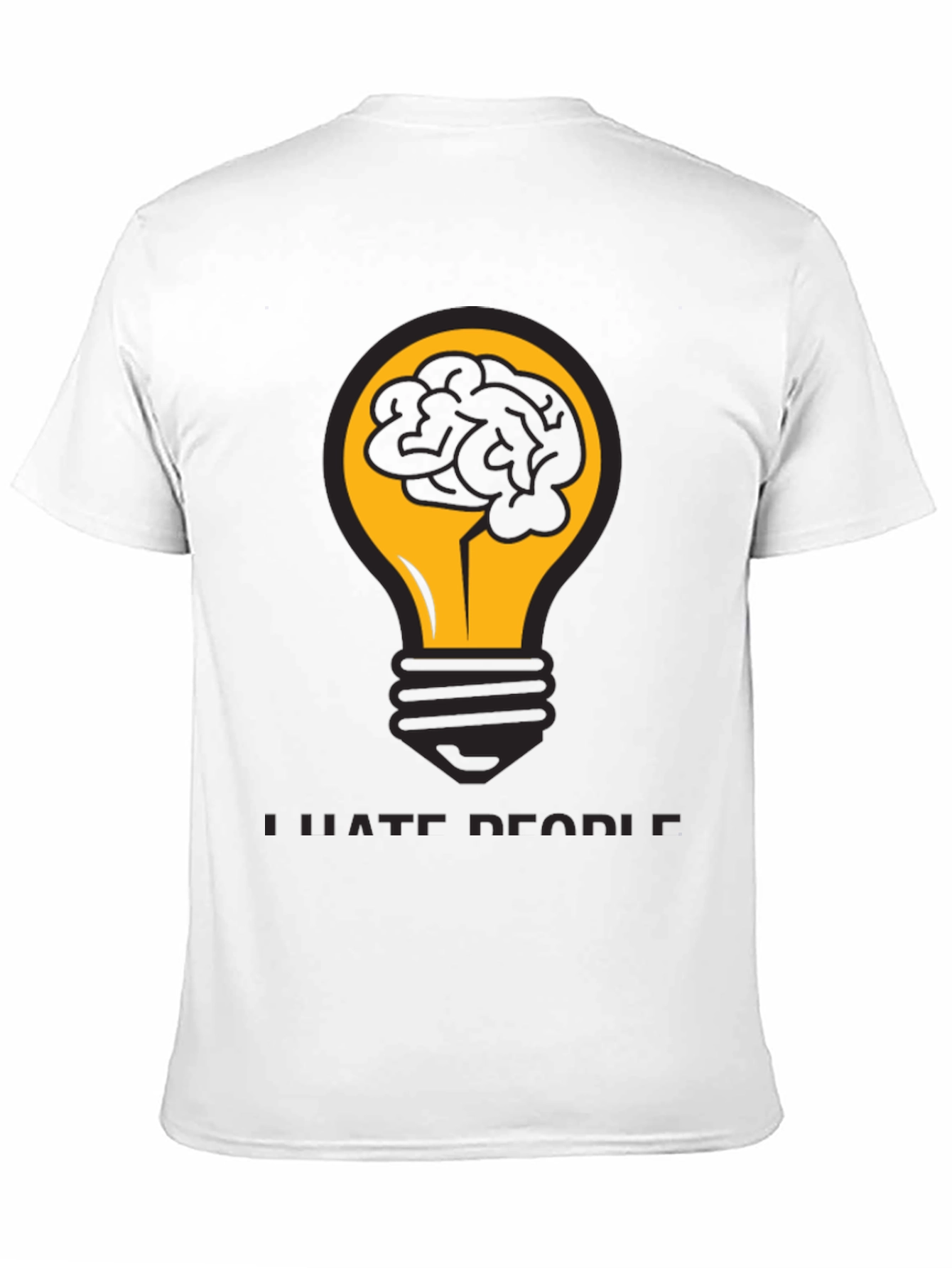 This stylish black t-shirt features a unique graphic design. A bright yellow lightbulb illuminates a brain silhouette, offering a clever and thought-provoking visual. The text "I HATE PEOPLE" is printed below the lightbulb, adding a touch of edgy humor to the design. Made from comfortable material, this tee is perfect for everyday wear. Show off your unique sense of style with this eye-catching and conversation-starting t-shirt. Makes a great gift for the smarty-pants in your life, or for anyone who likes making a statement.