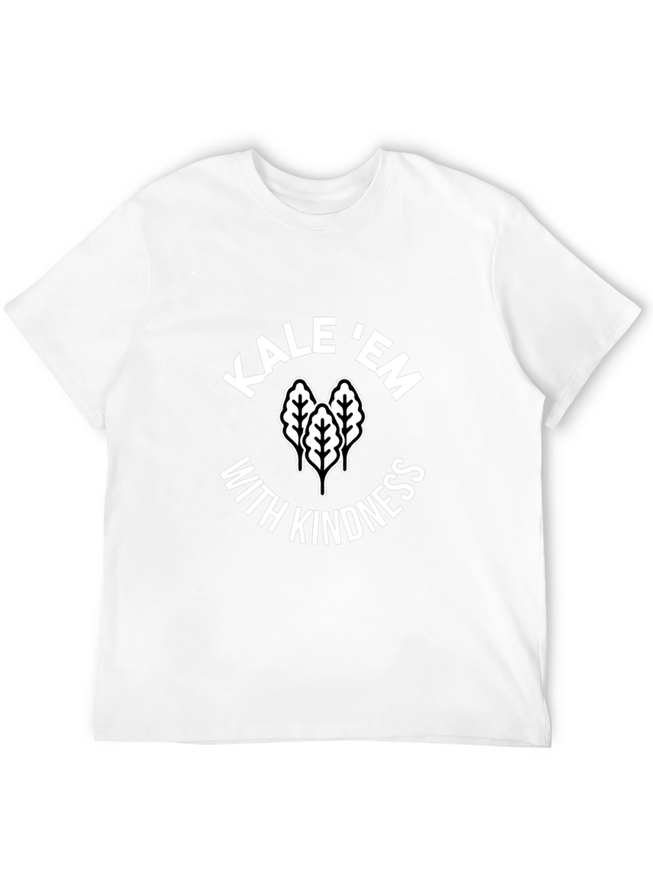 Show your love for healthy eating with this fun graphic t-shirt! The black tee features a white, stylized design that reads 'Kale 'Em With Kindness' arranged around three kale leaf images. Made from a soft fabric, this shirt is comfortable for everyday wear and is sure to spark conversations about your commitment to wellness. Perfect for wearing to the gym, the farmers market, or while spending time with friends. Get yours today!