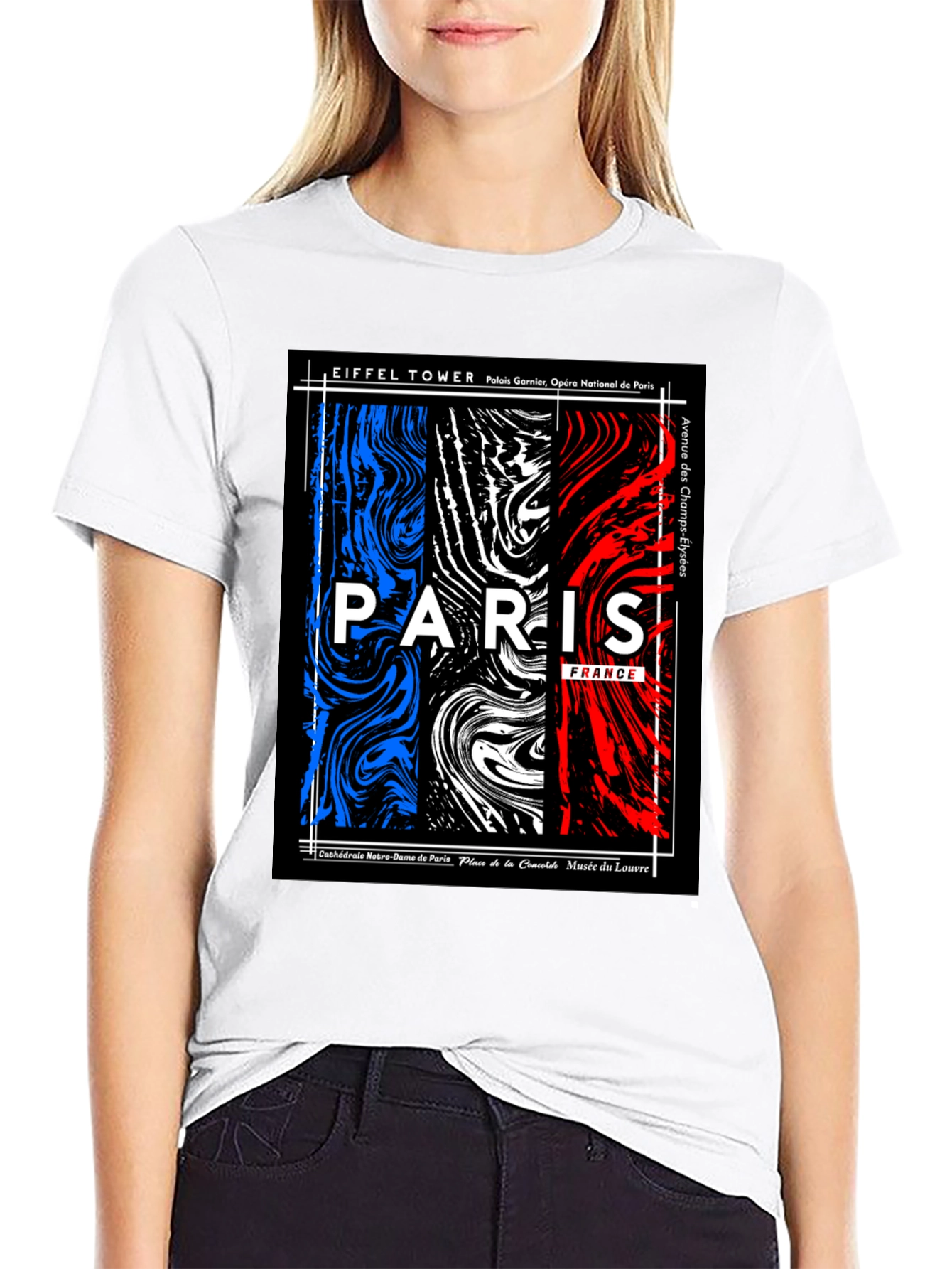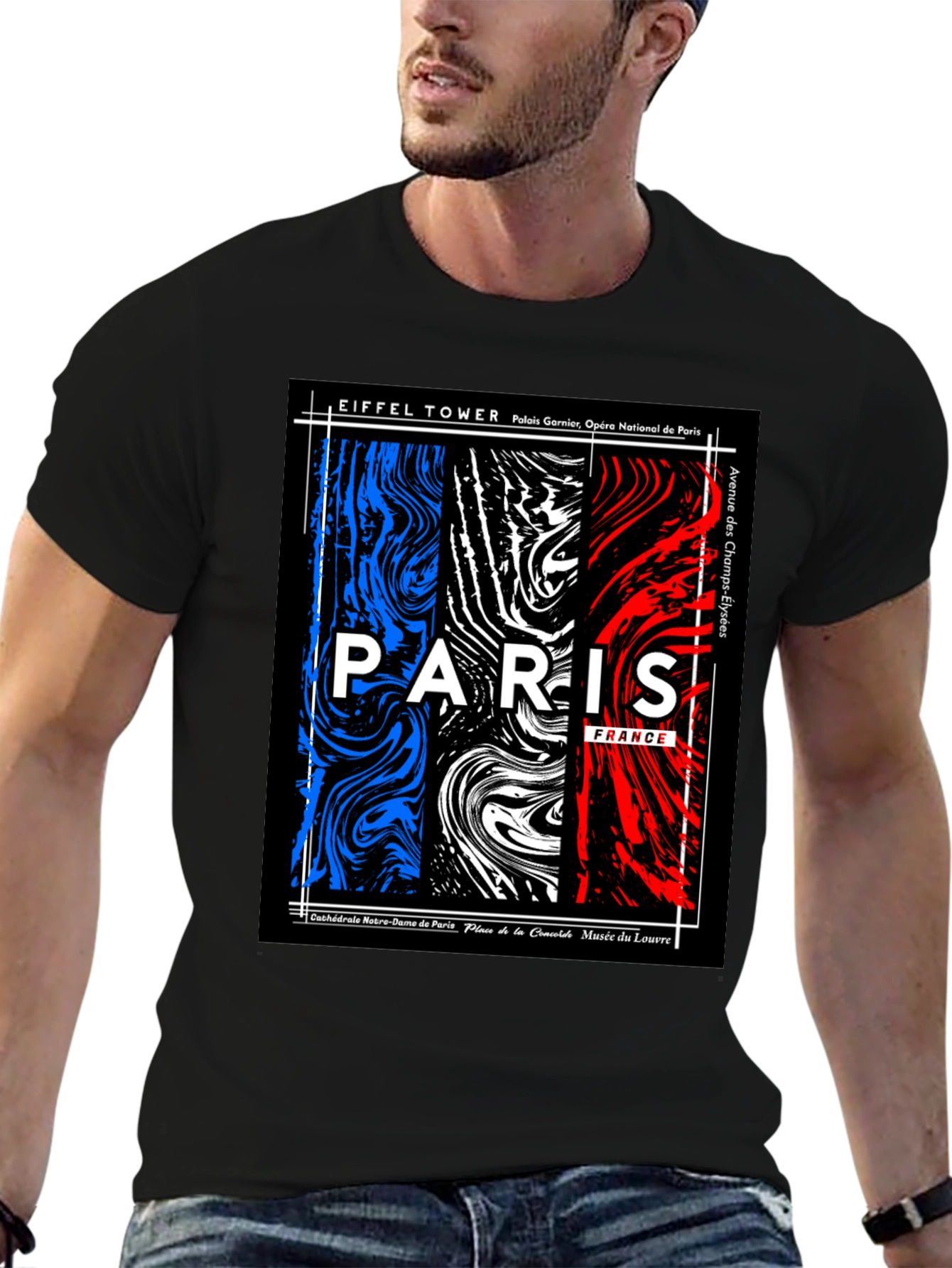 Show your love for the city of lights with this stylish black t-shirt. The design features the Eiffel Tower, Champs-Élysées, and other Paris landmarks in a unique artistic rendering of the French flag colors - blue, white, and red. The word "PARIS" is prominently displayed, making it perfect for tourists, Francophiles, or anyone who appreciates classic European style. This tee is great for casual wear, travel, or as a souvenir. Made with comfortable fabric, this shirt is both fashionable and durable. Get yours today and carry a piece of Paris with you!