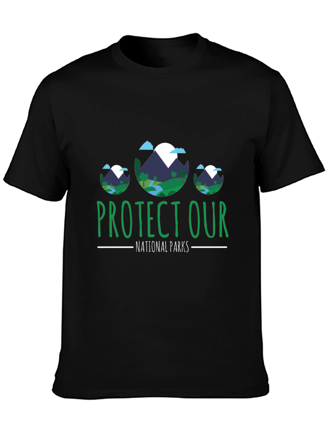 Show your love for nature with this black "Protect Our National Parks" t-shirt. The design features three landscape orbs showcasing mountain scenes, waterways and lush greenery. Made from soft, breathable fabric, this tee is perfect for everyday wear, hiking adventures, or casual outings. Support conservation efforts in style! It's a great way to make a statement and inspire others to join the cause. A comfortable and eco-friendly addition to your wardrobe, this graphic tee is a must-have for any nature enthusiast. Available in standard sizes.