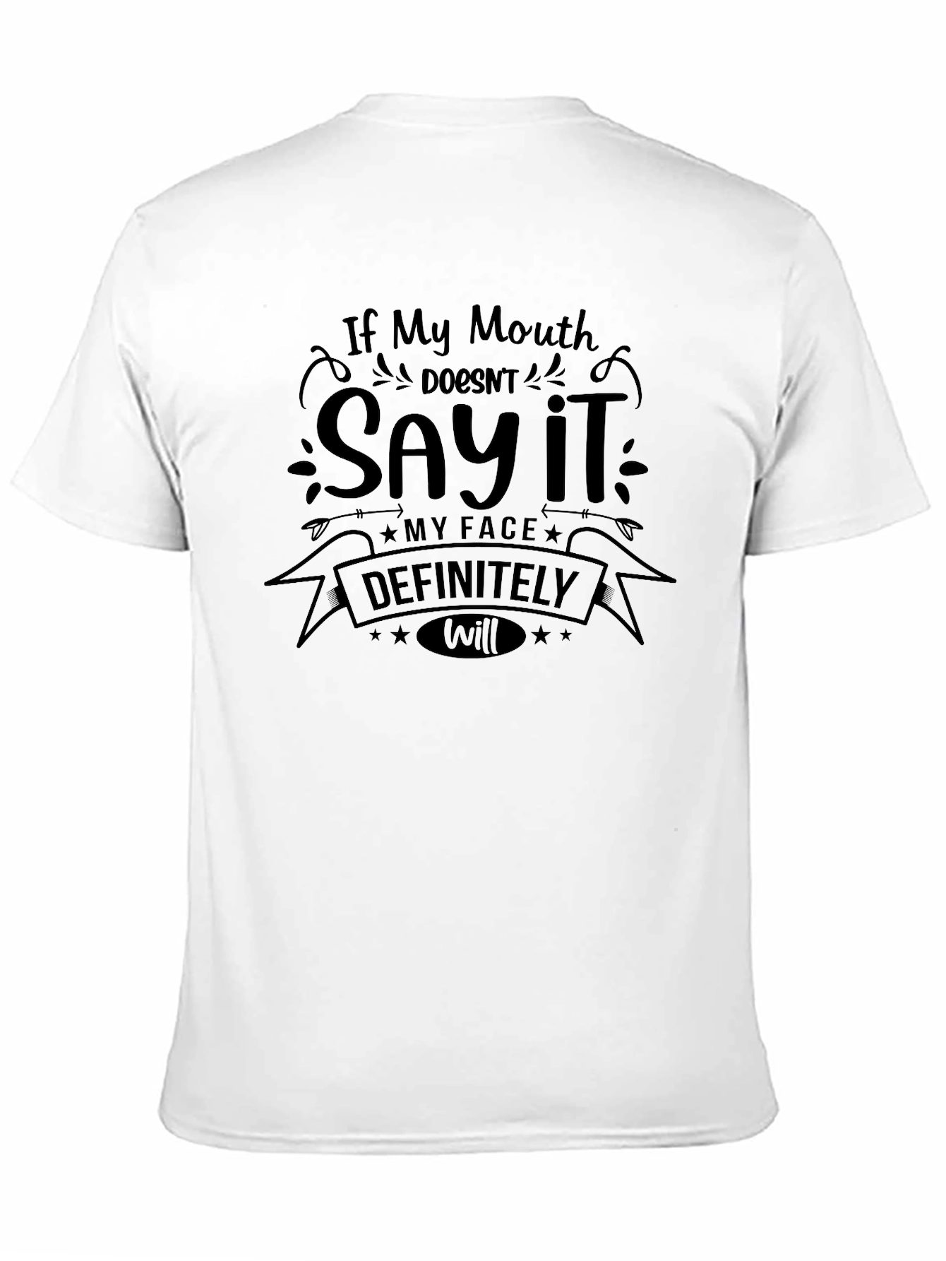 Make a statement without saying a word! This black graphic tee features a playful slogan: "If My Mouth Doesn't Say It, My Face Definitely Will." The design is printed in a matching black hue to creates a sleek, stand-out look. Crafted from a comfortable, soft fabric, this tee is perfect for everyday wear. Ideal for casual outings, social gatherings, or just lounging at home. Pair it with jeans, shorts, or leggings for a relaxed yet stylish outfit. Express your witty personality with this eye-catching t-shirt and let your face do the talking!
