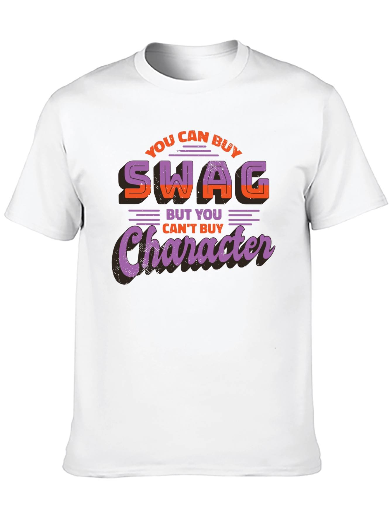 Show off your unique style with this bold and eye-catching t-shirt! This black tee features a striking graphic print with the phrase "You Can Buy Swag But You Can't Buy Character" in vibrant orange and purple lettering. The design has a cool, retro vibe, making it a standout piece in any casual wardrobe. Made from a soft, comfortable fabric, this t-shirt is perfect for everyday wear, whether you're hitting the streets, hanging out with friends, or making a statement at your next event. Express yourself and let your true character shine through!