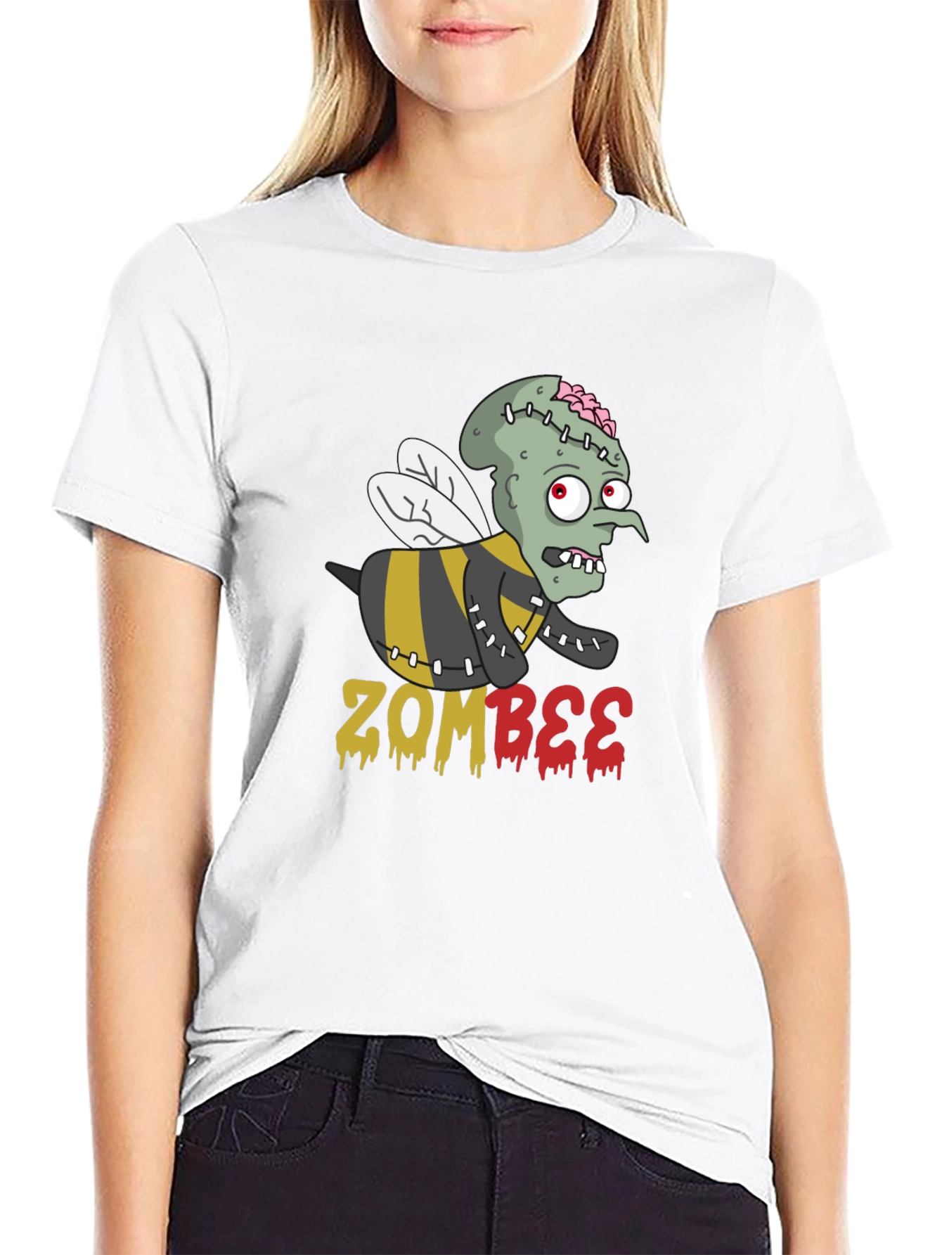 This black t-shirt features a unique and eye-catching design of a cartoon zombie bee, or "Zombee." The graphic showcases a zombie head attached to a black and yellow striped bee body with wings. The word "ZOMBEE" is written underneath in a dripping, stylized font, making it a perfect shirt for Halloween or anyone who loves quirky and spooky designs. The shirt appears to be made of a soft, comfortable material, suitable for everyday wear. Ideal for casual outings, themed parties, or as a standout piece in any wardrobe. Stand out with this fun and spooky shirt!