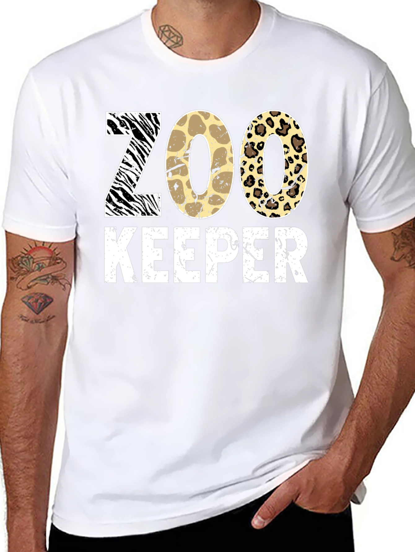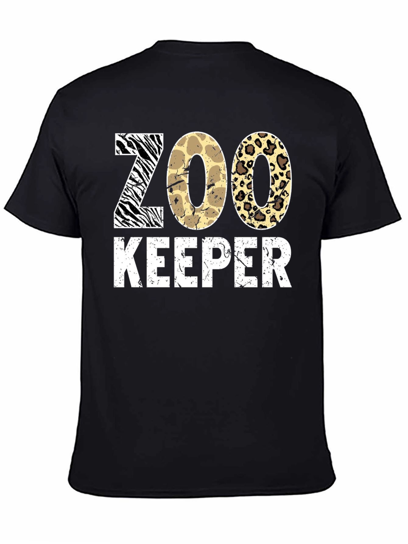 Showcase your love for wildlife with this stylish Zoo Keeper T-shirt. Featuring the words "ZOO KEEPER" in a unique animal-inspired print, this shirt is a must-have for animal enthusiasts. The word "ZOO" uses zebra, giraffe, and leopard patterns. The design stands out with its distressed white lettering. This shirt is ideal for casual wear, zoo visits, or as a thoughtful gift for animal lovers. Embrace your passion for wildlife conservation with this fashionable and comfortable piece.